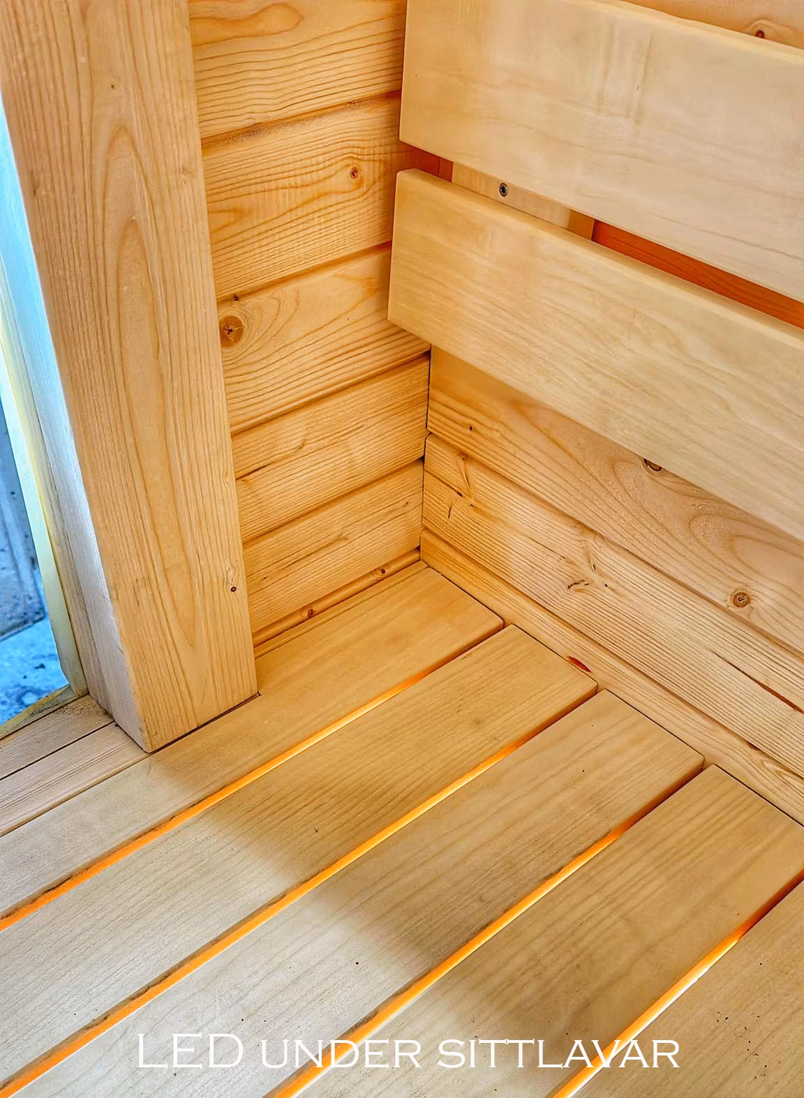 Sittlavarna är tillverkade av asp som inte blir varmt, spricker eller fäller ut kåda. Även ryggstöd i asp, dessa är utmärkta att hänga en handduk över för att slippa fläckar i bastun.