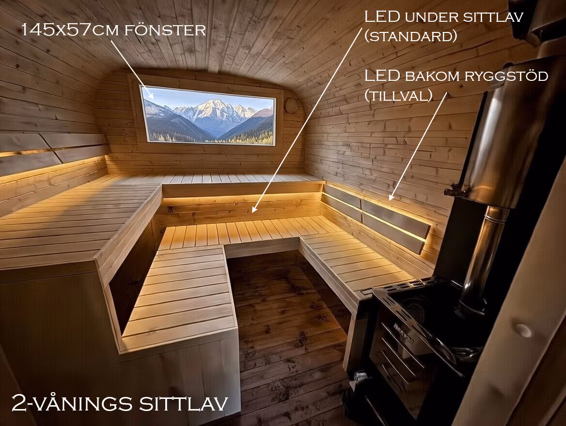 Samma bredd (245cm) som många runda bastutunnor men med en helt annan rymd inuti.