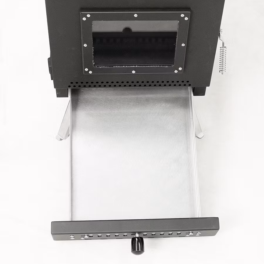 En bra asklåda med ställbart drag för kaminen, lätt att tömma på aska.